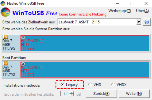 Schritt 4. Klicken Sie auf die Option Legacy. Klicken Sie dann auf Weiter und Ihr Windows 10 USB-Laufwerk wird erstellt.