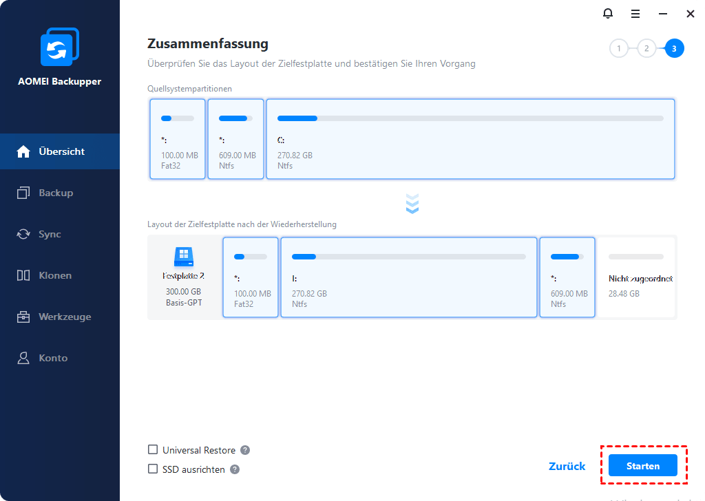 Schritt 6. Führen Sie im Fenster „Zusammenfassung“ die letzte Überprüfung durch und klicken Sie dann auf Starten, um fortzufahren. Wenn Sie das Systemabbild auf einem anderen PC wiederherstellen, sollten Sie das Kontrollkästchen „Universal Restore“ für einen sicheren Start aktivieren.