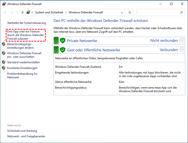 Schritt 2. Navigieren Sie zum linken Bereich und klicken Sie auf die Option „Eine App oder ein Feature durch die Windows Defender Firewall zulassen“, um die installierten Antivirenanwendungen zu deaktivieren.