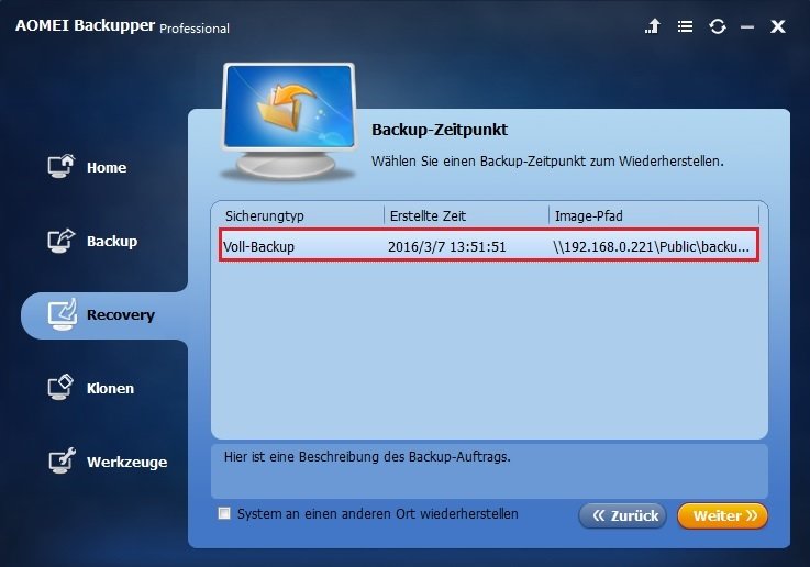 Schritt 5. Alle System-Images werden im Fenster aufgelistet. Bitte wählen Sie ein System-Backup-Image zum Wiederherstellen aus und klicken Sie auf Weiter.