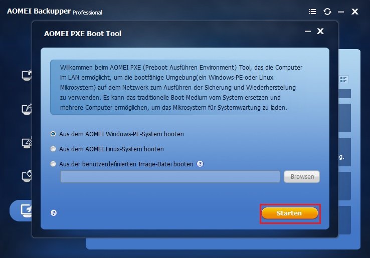 Schritt 3. Dann starten Sie zum AOMEI Backupper WinPE/Linux-System mit einem bootfähigen Medium oder einem PXE Boot Tool.
