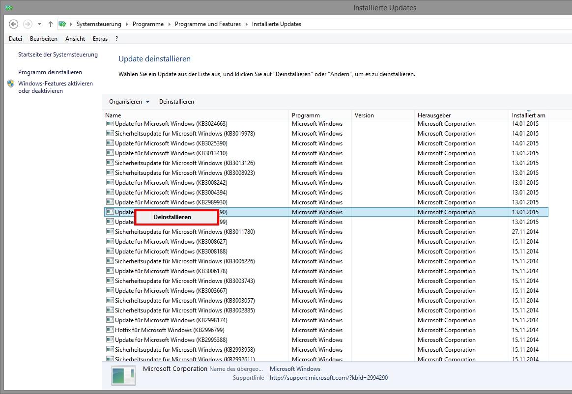 - Im nächsten Fenster klicken Sie mit der rechten Maustaste auf das Update, das Sie entfernen möchten, und wählen Sie dann Deinstallieren.