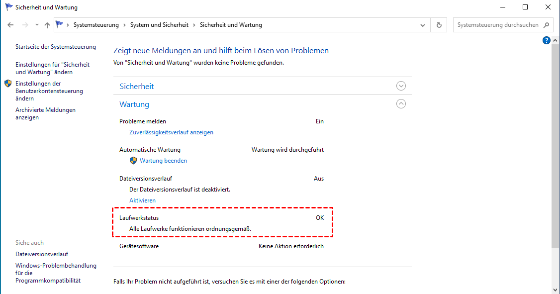 Methode 3. Laufwerkstatus durch Sicherheit und Wartung prüfen