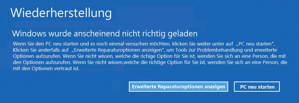 „Mein Laptop funktionierte einwandfrei, bis er letzte Nacht plötzlich nicht mehr reagierte und einen blauen Bildschirm anzeigte. Nach dem Neustart blieb der blaue Bildschirm und zeigte die Fehlermeldung: Windows wurde anscheinend nicht richtig geladen.