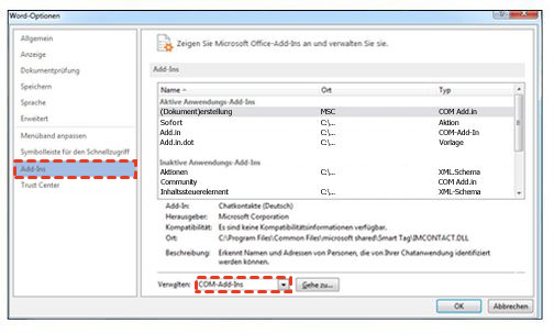 2. Wählen Sie im Abschnitt Verwalten die Option COM-Add-ins.