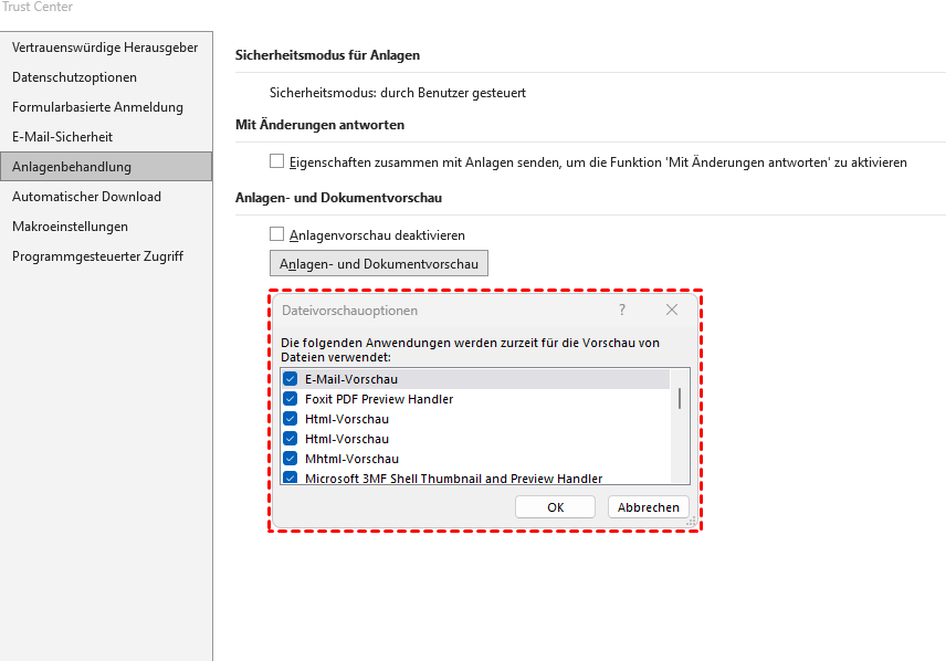 2. Wählen Sie Anlagenbehandlung. Suchen Sie die Option Anlagen- und Dokumentvorschau und schalten Sie die Option Anlagenvorschau deaktivieren aus.