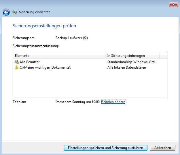 Schritt 3. Der Zeitplan ist standardmäßig auf 7 Uhr pro Woche eingestellt. Wenn Sie diese Einstellung ändern möchten, klicken Sie auf „Zeitplan ändern“. Überprüfen Sie danach Ihre Sicherungseinstellungen, klicken Sie auf „Einstellungen speichern und Sicherung ausführen“, um den letzten Schritt abzuschließen. Warten Sie, bis Sie die Meldung „Windows-Sicherung wurde erfolgreich abgeschlossen“ sehen.
