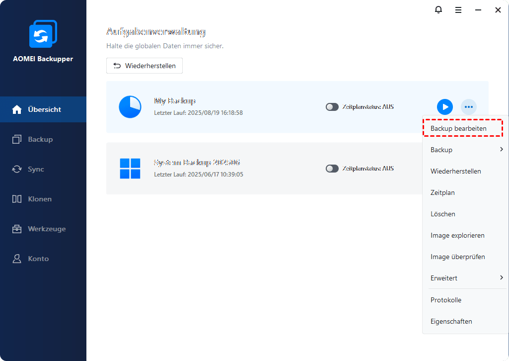 ✨ Suchen Sie die Sicherungsaufgabe auf der Registerkarte „Übersicht“, klicken Sie auf das Symbol mit den drei Balken und dann auf „Zeitplan“.