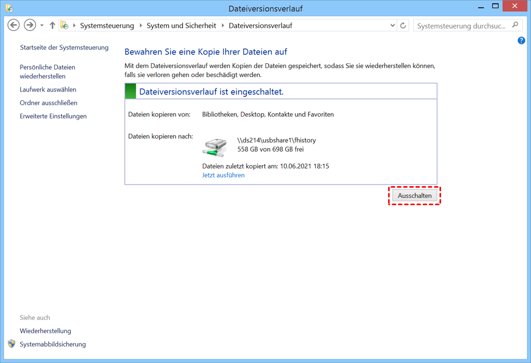 - Gehen Sie zu Systemsteuerung -> System und Sicherheit -> Dateiversionsverlauf. Klicken Sie dann auf „Ausschalten“, wenn dort steht, dass der Dateiversionsverlauf eingeschaltet ist.