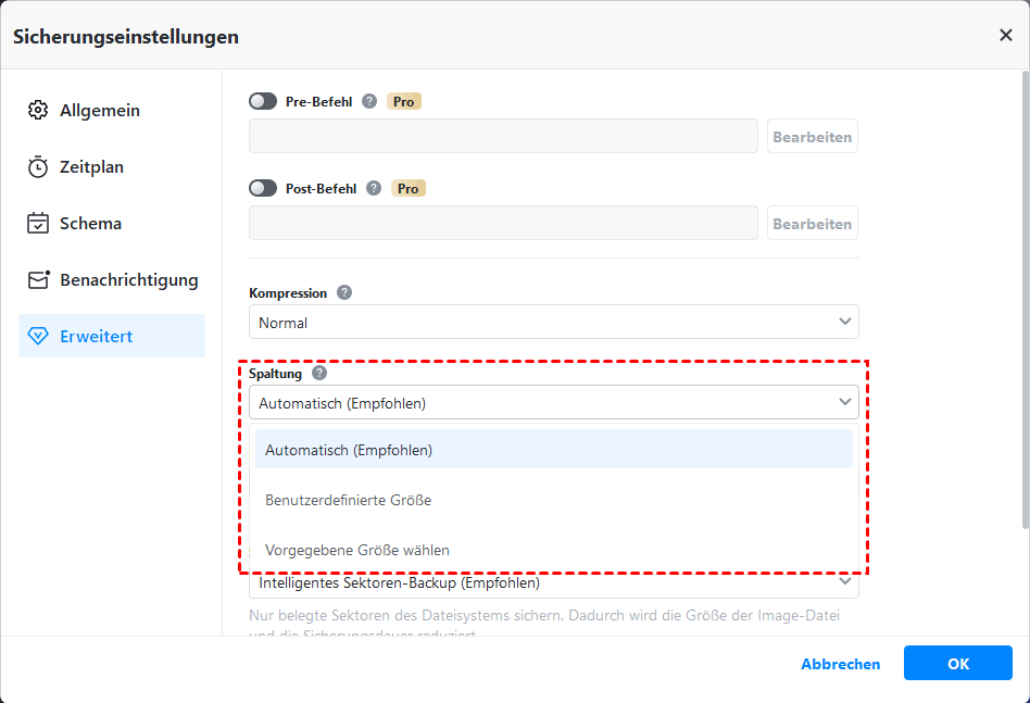 4. Klicken Sie auf Optionen > Erweitert > Spaltung, um die Größe anzugeben, in die Sie die Image-Datei aufteilen möchten, und klicken Sie auf OK, um dies zu bestätigen. Alternativ können Sie auch die Automatische Spaltungsfunktion verwenden, mit der das Backup-Image je nach dem Dateisystem der Zielfestplatte auf 4 GB oder 2 GB aufgeteilt wird. Klicken Sie dann auf Starten, um große Dateien auf externe Festplatte zu sichern.