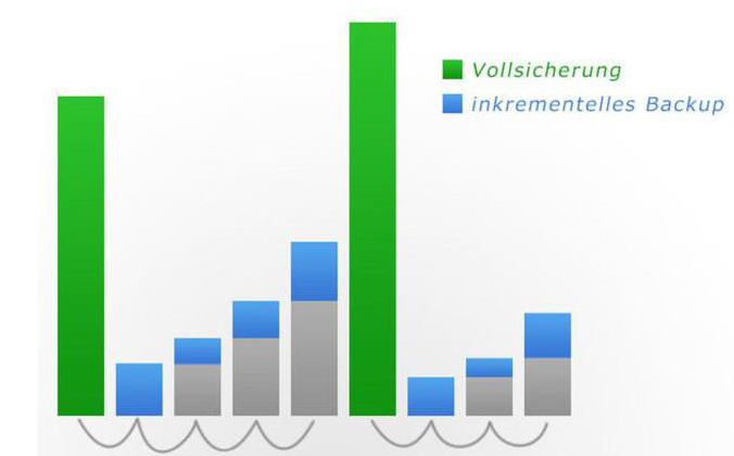 Ein inkrementelles Backup ist eine Sicherung aller geänderten Dateien seit der letzten vollständigen oder inkrementellen Sicherung. Daten, die sich nicht geändert haben, werden nicht gesichert. Daher sind sowohl der Zeitaufwand als auch der benötigte Speicherplatz für inkrementelle Backups geringer als bei einem Voll-Backup.