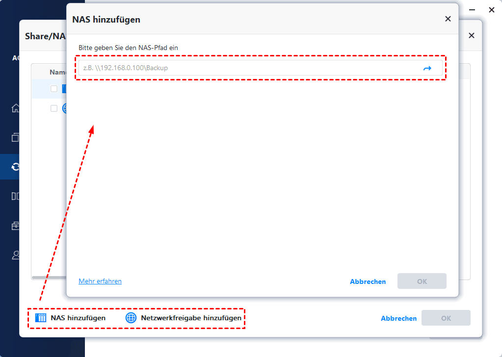Wenn Sie Dateien von Netzwerkspeichern hinzufügen möchten, klicken Sie in dem sich öffnenden Fenster auf Share/NAS und dann auf NAS hinzufügen/Netzwerkfreigabe hinzufügen, um den Pfad anzugeben.