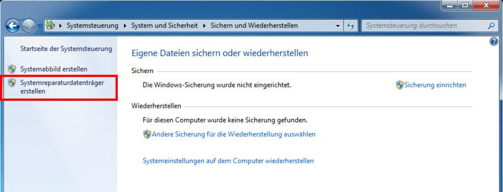 2. Gehen Sie zu Start > Systemsteuerung > System und Sicherheit > Sichern und Wiederherstellen > Systemreparaturdatenträger erstellen.