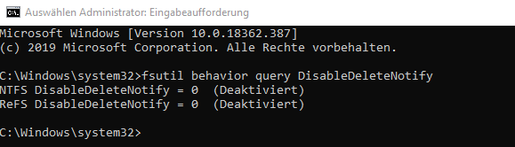 Schritt 2. Geben Sie „fustil behavior query Disabledeletenotify“ in das Fenster ein und drücken Sie „OK“ oder drücken Sie „Enter“, um fortzufahren.