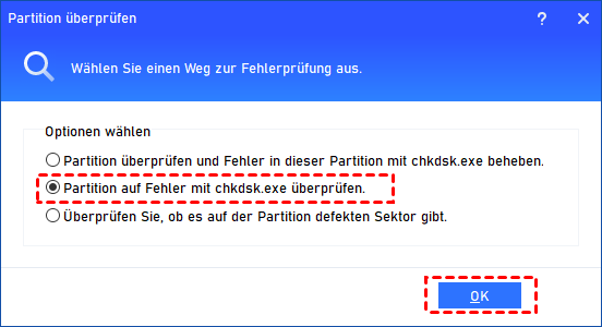 Schritt 3. Wählen Sie „Partition überprüfen und Fehler in dieser Partition mit chkdsk.exe beheben“ > klicken Sie auf „OK“. Bitte wählen Sie die letzte Option, wenn Ihre Festplatte im RAW-Format vorliegt.