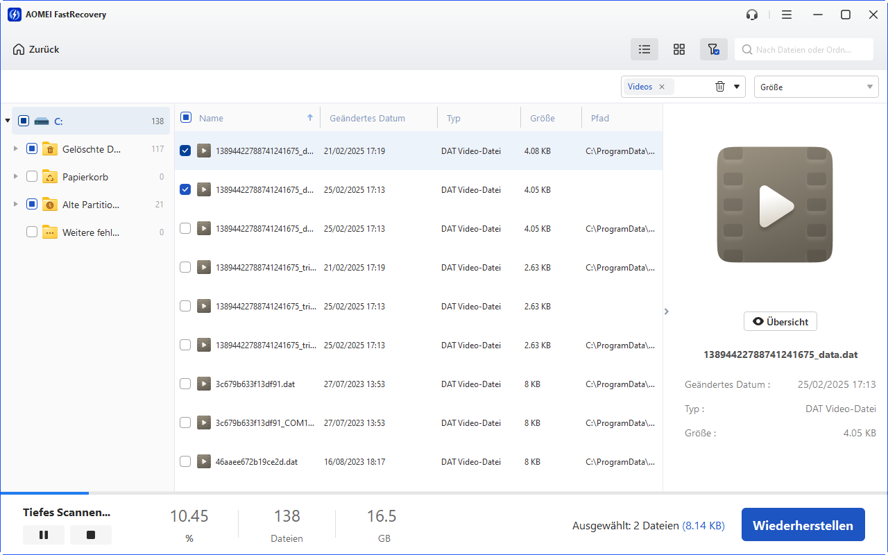 Schritt 2. AOMEI Datenrettungssoftware führt einen Schnellscan und Tiefenscan für Sie durch. Während des Prozesses können Sie direkt die Dateien aus der Liste der gescannten Dateien auswählen, um sie wiederherzustellen, oder auf ein vollständiges Ergebnis warten.