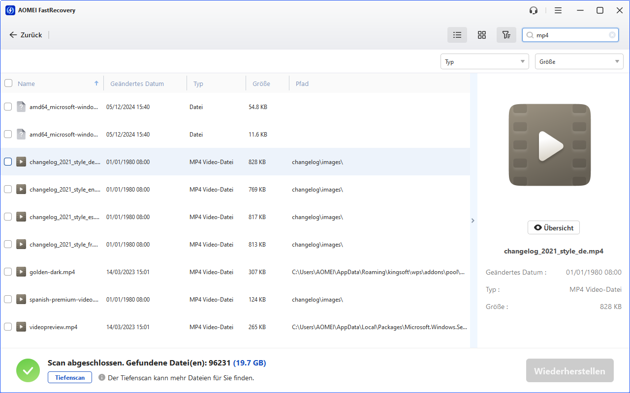 Um gelöschte Dateien von einem USB-Laufwerk wiederherzustellen, zum Beispiel MP4, klicken Sie auf „Filter“ > „Typ“und wählen Sie „Videos“. Geben Sie dann MP4 in das Feld Suche nach Dateien oder Ordnern ein. Es werden alle gelöschten MP4-Dateien im folgenden Fenster aufgelistet.