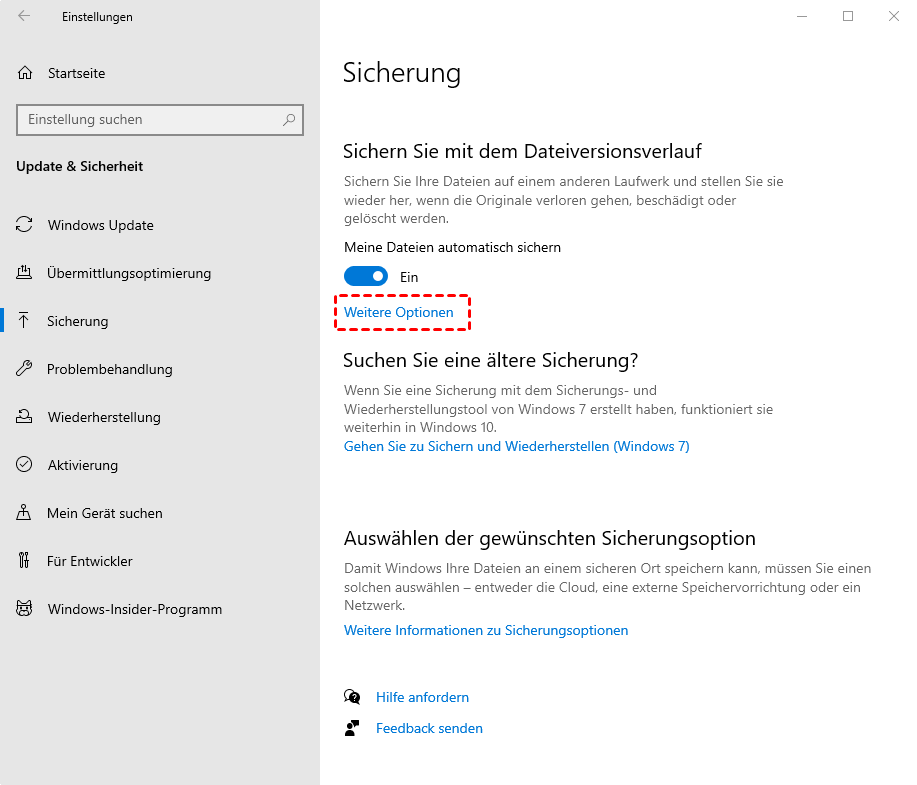 Der Dateiversionsverlauf ist darauf spezialisiert, Ihre persönlichen Dateien von allen in Windows 10 angebotenen Sicherungslösungen zu sichern. Wie bei jedem anderen Sicherungssystem müssen Sie es jedoch vor dem Dateiverlust aktivieren. Der Dateiversionsverlauf unterstützt Windows 8 und höher. In diesem Teil werden Verfahren zum Einrichten des Dateiversionsverlaufs und zum Wiederherstellen gelöschter Dateien über diesen angezeigt.