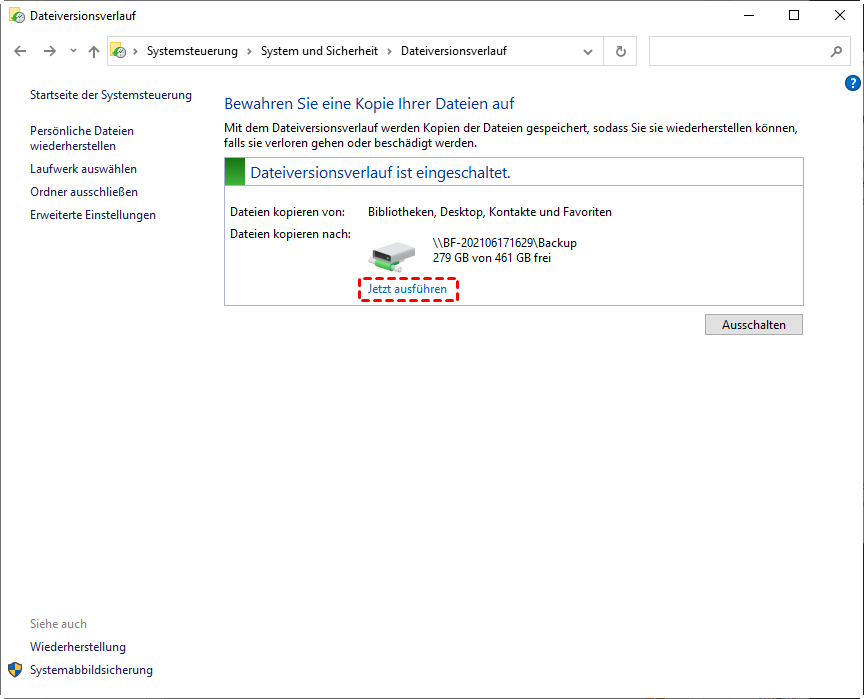 Schritt 5: Der Dateiversionsverlauf wird aktiviert und Sie können das externe Laufwerk zum Speichern von Sicherungskopien verwenden. Es ist besser, das erste Backup manuell zu erstellen. Klicken Sie auf „Jetzt ausführen“ unter dem Symbol Ihres Laufwerks.