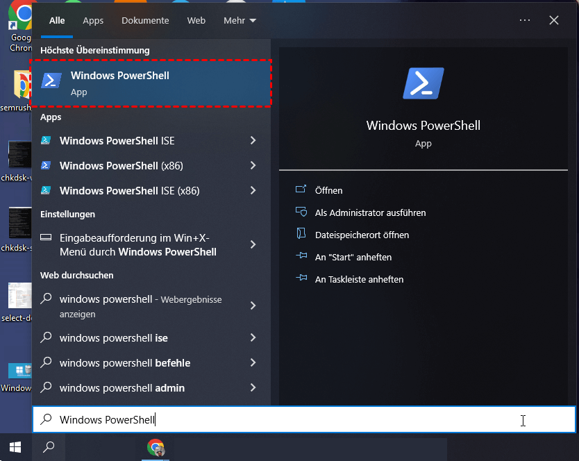 Alternativ können Sie auch „cmd“ oder „PowerShell“ in die Suchleiste eingeben, mit der rechten Maustaste auf die gewünschte Option klicken und „Als Administrator ausführen“ wählen.