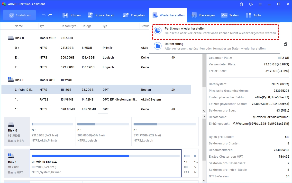 Schritte zur Wiederherstellung von Partitionen und Dateien mit AOMEI Partition Assistant