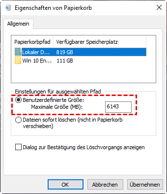 Ja, der Papierkorb hat eine Größenbeschränkung. Die Standardspeicherkapazität für den Papierkorb beträgt etwa 5 % der Gesamtgröße Ihres Laufwerks.