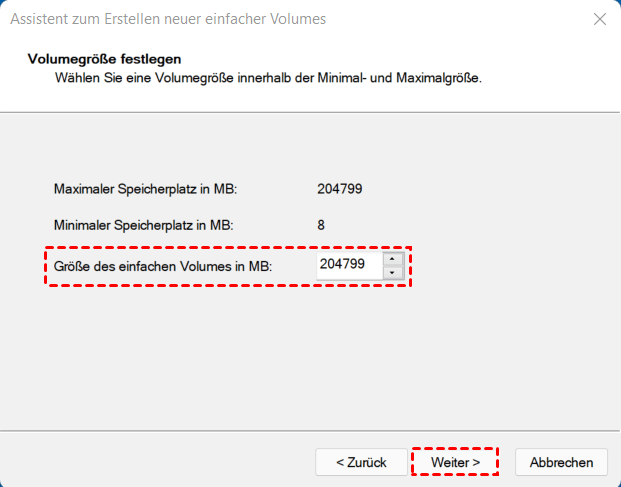 Schritt 4: Geben Sie im Fenster „Größe des einfachen Volumes in MB“ eine kleinere einfache Volumesgröße in MB ein und klicken Sie auf die Schaltfläche „Weiter“.