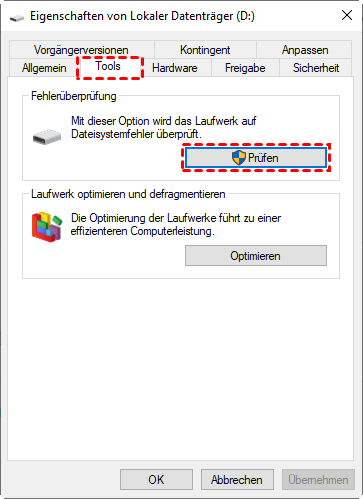 Schritt 2: Gehen Sie im Eigenschaftenfenster auf die Registerkarte „Tools“ und klicken Sie auf „Prüfen“ im Abschnitt „Fehlerüberprüfung“.