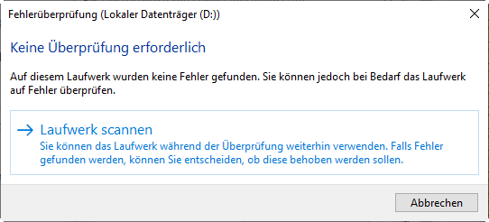 Die Parameter „/f“ weisen darauf hin, dass Fehler auf dem Laufwerk behoben werden sollen.