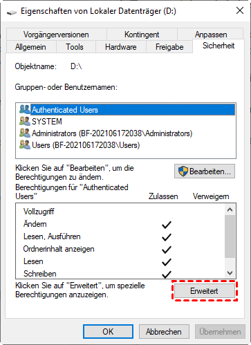 Schritt 4: Gehen Sie zu „Sicherheit“ > „Erweitert“, suchen Sie den Besitzer und klicken Sie auf „Ändern“.