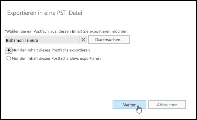 - Der Assistent zum Exportieren in eine PST-Datei wird geöffnet. Wählen Sie auf der ersten Seite das Quellpostfach aus und wählen Sie eine dieser Optionen aus. Klicken Sie dann auf Weiter: