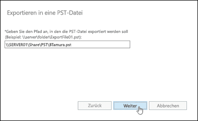- Auf der nächsten Seite geben Sie den UNC-Pfad und den Dateinamen der Ziel-PST-Datei ein und klicken Sie auf Weiter.