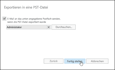 - Im Assistenten zum Exportieren in eine PST-Datei im EAC wählen Sie aus, ob Sie Benachrichtigungen erhalten möchten, und klicken Sie auf Fertig stellen.