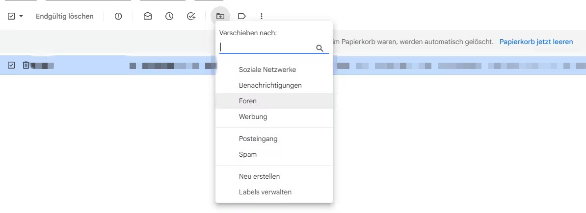 Schritt 2. Wählen Sie im Ordner Papierkorb die E-Mail aus, die Sie wiederherstellen möchten. Um alle Nachrichten wiederherzustellen, wählen Sie den Kreis neben Verschieben nach aus und wählen Sie dann einen Ordner, der nicht gelöscht wurde.