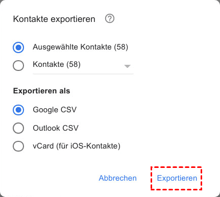 - Google CSV (google.csv): Diese Option ermöglicht es Ihnen, die Kontakte in ein anderes Gmail-Konto zu importieren.