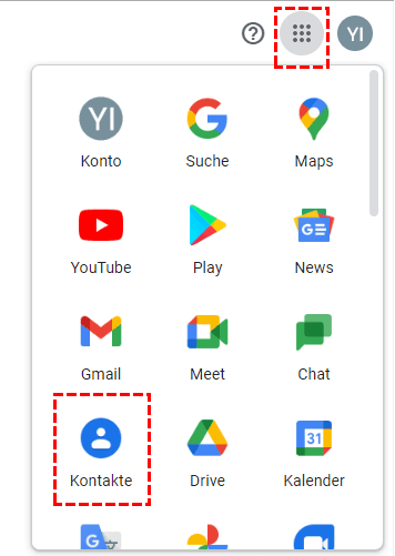 Schritt 1. Melden Sie sich bei Ihrem Gmail-Konto an und klicken Sie auf das Google App-Symbol oben rechts auf Ihrem Bildschirm. Wählen Sie im Dropdown-Menü Kontakte aus.