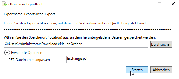 - Das eDiscovery-Exporttool wird gestartet. Fügen Sie den zuvor kopierten Exportschlüssel ein und geben Sie einen Ordner an, in dem Sie die PST-Dateien speichern möchten. Klicken Sie dann auf Starten, um den Export zu beginnen.