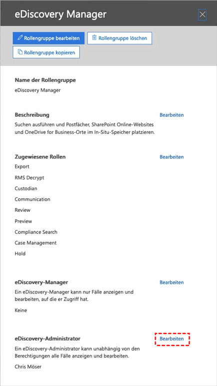 📝 Hinweis: Der Rollengruppe sind normalerweise die folgenden Rollen zugewiesen: Fallverwaltung, Compliance-Suche, Export, Hold, Vorschau, Überprüfung und RMS-Entschlüsselung. Wenn die Exportrolle fehlt, können Sie sie durch Klicken auf die Schaltfläche Rollengruppe bearbeiten hinzufügen.