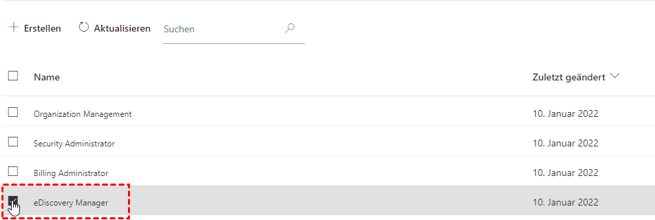 - Im Microsoft 365 Defender Admin Center gehen Sie zu Berechtigungen > E-Mail & Zusammenarbeit > Rollen und klicken auf die Rollengruppe eDiscovery Manager.