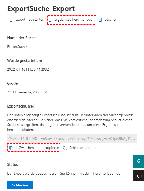 - Sie können entweder auf die Fertigstellung der Aufgabe warten oder sofort auf Ergebnisse herunterladen klicken. Wenn Sie mit dem Herunterladen der Ergebnisse beginnen, bevor der Export abgeschlossen ist, sollten der Download und die Export-Tools gleichzeitig fertig werden. Vergessen Sie nicht, den speziellen Exportschlüssel zu kopieren, der im nächsten Schritt benötigt wird.