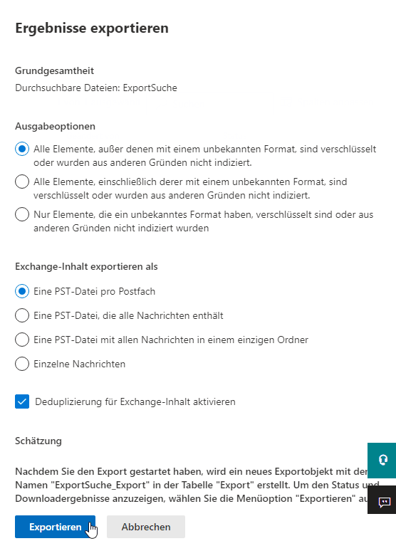 📝 Hinweis: Aktivieren Sie nicht die Option Deduplizierung aktivieren, es sei denn, Sie möchten, dass die Suchergebnisse in eine einzelne PST-Datei exportiert werden.