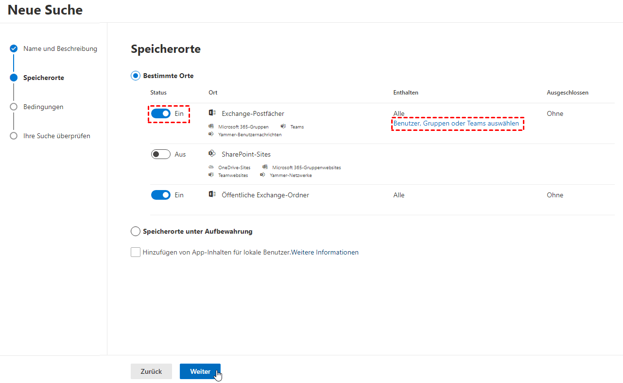 - Speicherorte: Legen Sie fest, welche Postfachdaten Sie exportieren möchten. Wenn Sie Daten aus allen Postfächern exportieren möchten, wählen Sie Exchange-Postfächer aus. Sie können Ihre Suche auf bestimmte Benutzer, Gruppen oder Teams eingrenzen, indem Sie auf den Link klicken und bestimmte Elemente in einem Auswahlfeld auswählen.