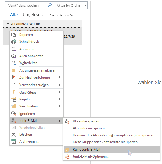 Zum Glück können Sie diese E-Mails leicht in Ihren Posteingang zurückverschieben. In Zukunft können Sie Outlook auch anweisen, E-Mails von diesem bestimmten Absender nicht mehr als Junk-Mail zu kennzeichnen.