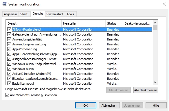 2. Navigieren Sie im Systemkonfigurations-Assistenten zu Dienste. Aktivieren Sie das Kontrollkästchen Alle Microsoft-Dienste ausblenden und klicken Sie auf Alle deaktivieren.