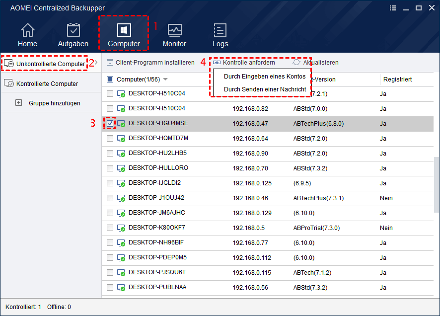 Das Beispiel, das ich hier verwende, ist AOMEI Centralized Backupper. Es kann auf jedem Computer mit Windows 11/10/8/7/Vista/XP oder Windows Server 2022/2019/2016/2012(R2)/2008(R2)/usw. als zentrale Konsole installiert werden, von der aus Sie die Kontrolle über Client-PCs oder Server im LAN für Backup und Überwachung erhalten.
