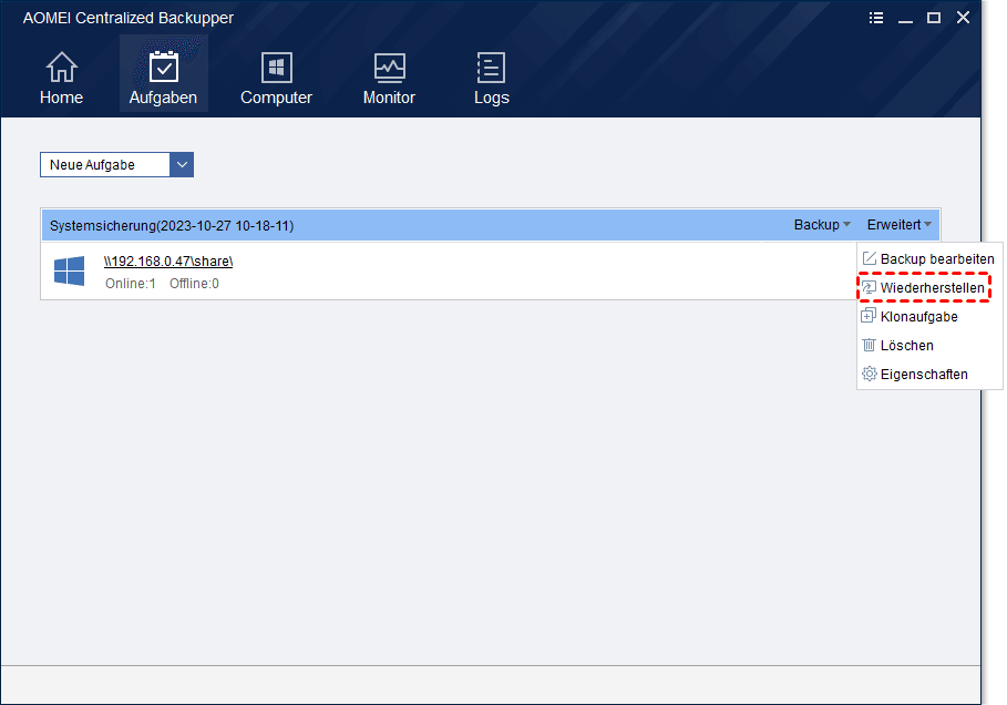 👉 Alle Aufgaben werden auf der Registerkarte „Aufgaben“ aufgelistet, sodass Sie sie zentral verwalten oder sogar bestimmte Daten von einem Client auf einen anderen wiederherstellen können.