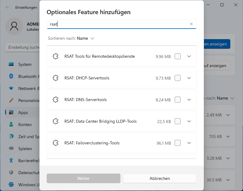 - RSAT: Tools für Active Directory Domain Services (AD DS) und Tools für Active Directory Lightweight Directory Services (AD LDS)