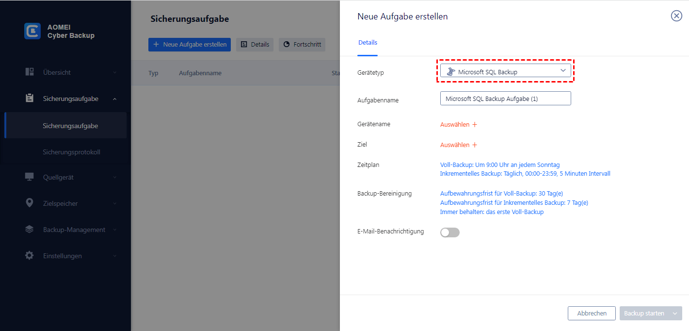 1. Klicken Sie auf Sicherungsaufgabe -> Neue Aufgabe erstellen, um die Seite zur Erstellung der Aufgabe zu öffnen. Wählen Sie den Sicherungstyp als Microsoft SQL Backup.