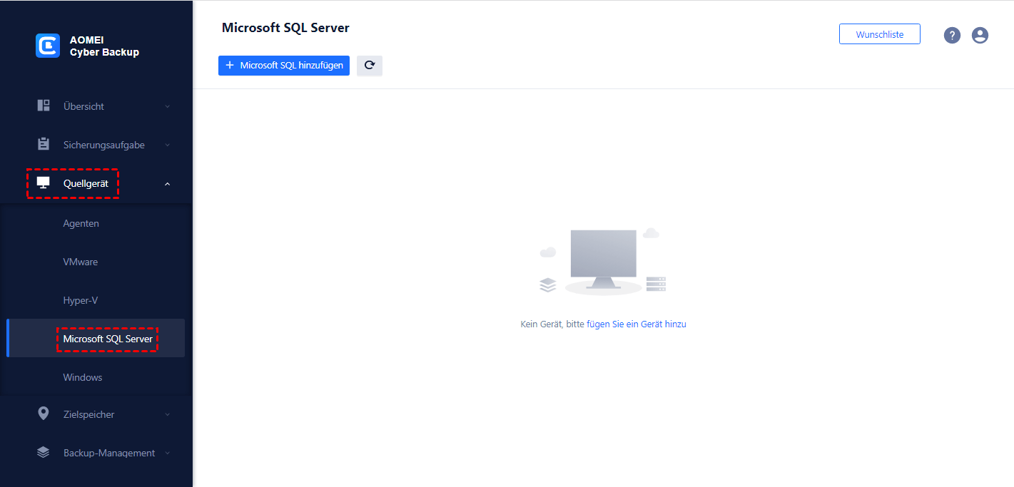 1. Starten Sie das installierte AOMEI Cyber Backup auf dem Server, navigieren Sie zu Quellgerät -> Microsoft SQL Server -> Microsoft SQL hinzufügen.