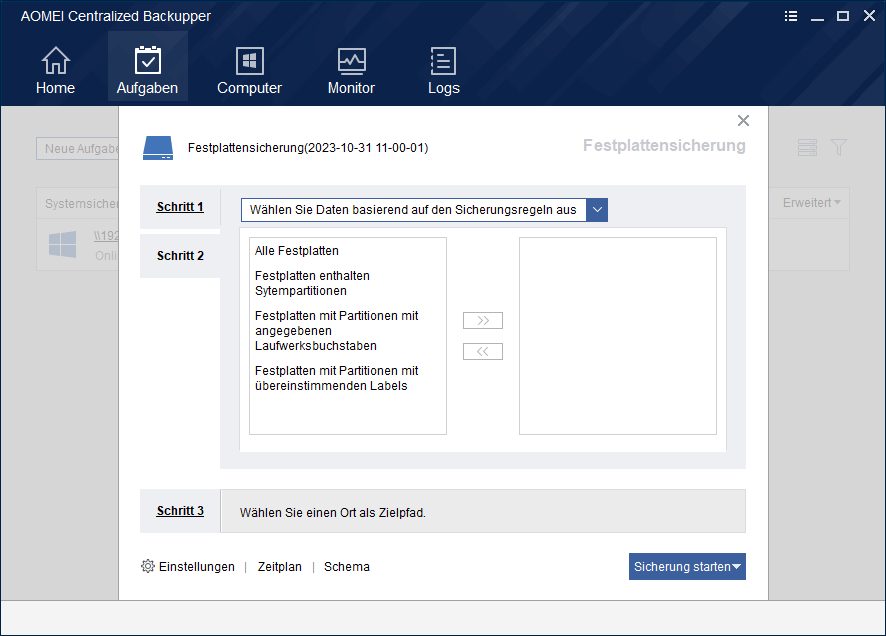 👉 Zeitplan: Legen Sie eine automatische Sicherung fest (einmal täglich, wöchentlich oder monatlich) und wählen Sie aus, ob Sie ein Voll-Backup, inkrementelles Backup oder differentielles Backup durchführen möchten.